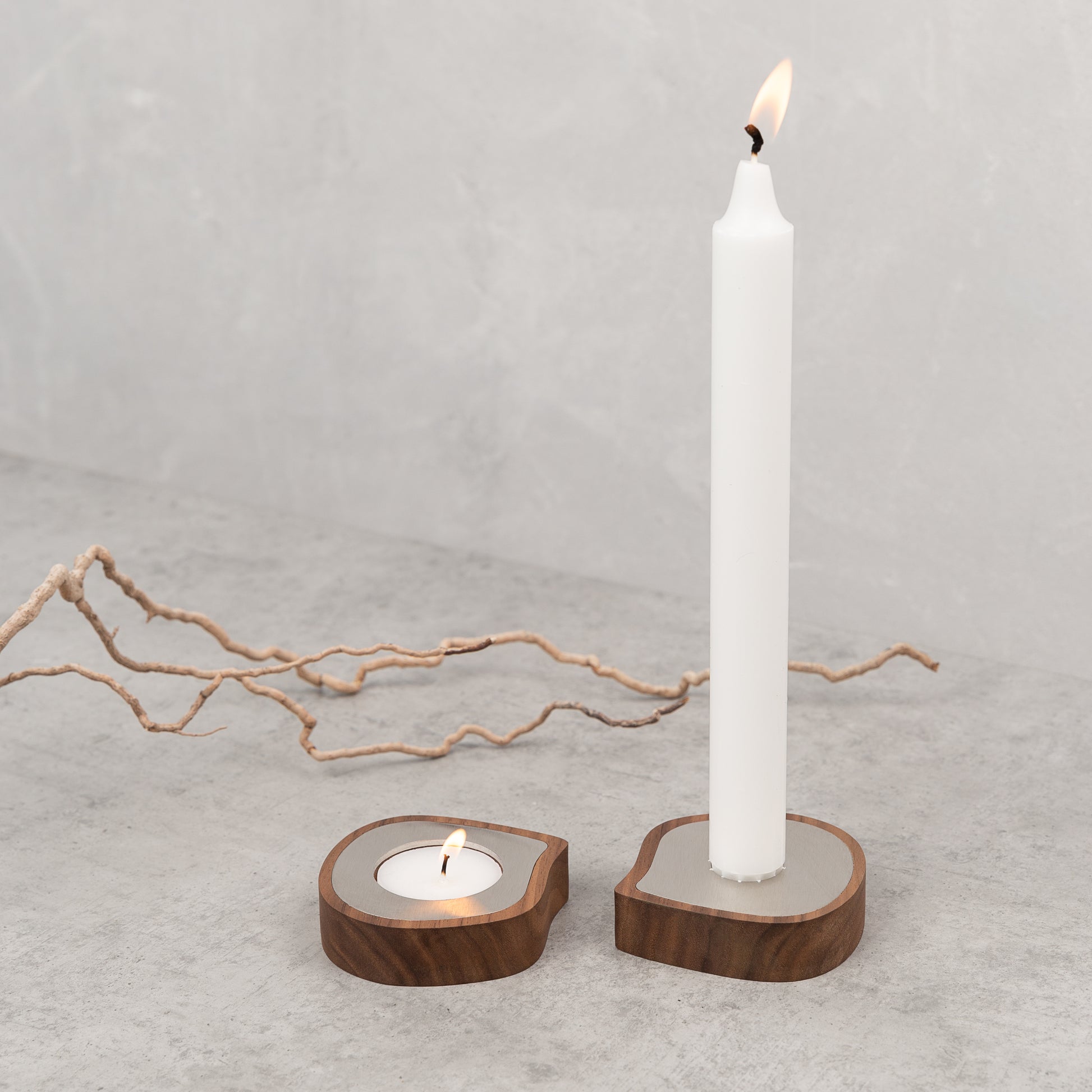 Organic shape wooden candle holder with an elegant touch of metal. The minimalistic and subtle design.